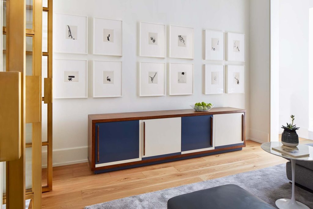 The clients required space for both large business social events and more intimate private gatherings that reflect their shared passions for art, architecture, travel, and food. They specifically requested two offices and walk-in closets, unique, one of a kind custom elements and space for their grand piano without disturbing neighbouring units.
