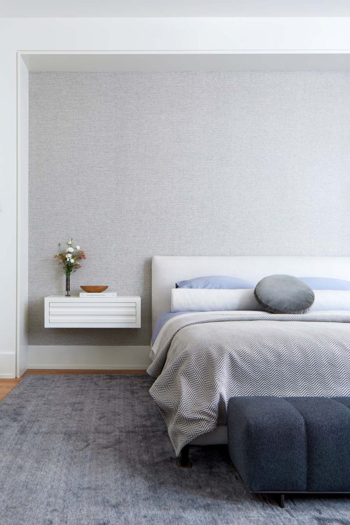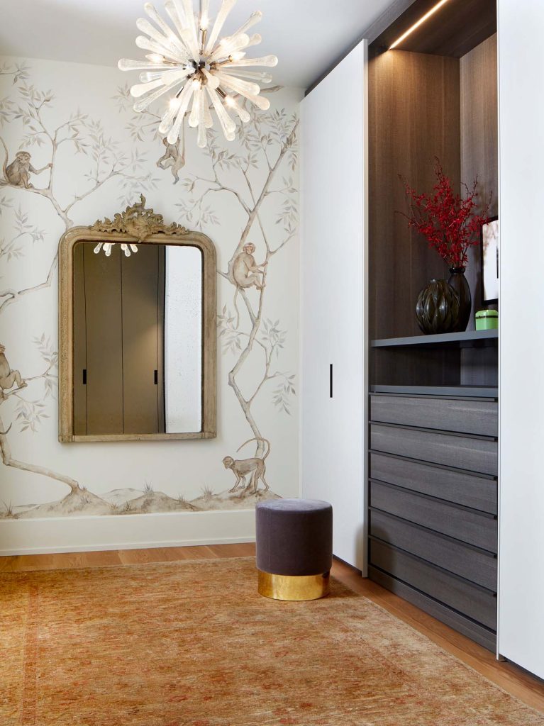 Furnishings, such as acoustically engineered fabric wall panels, or a custom designed colour-blocked credenza and floating bedside tables that reference the work of Charlotte Perriand, and finally a whimsical chinoiserie wall mural in the dressing area, all find their inspiration in 1930s luxury French design and craftsmanship.