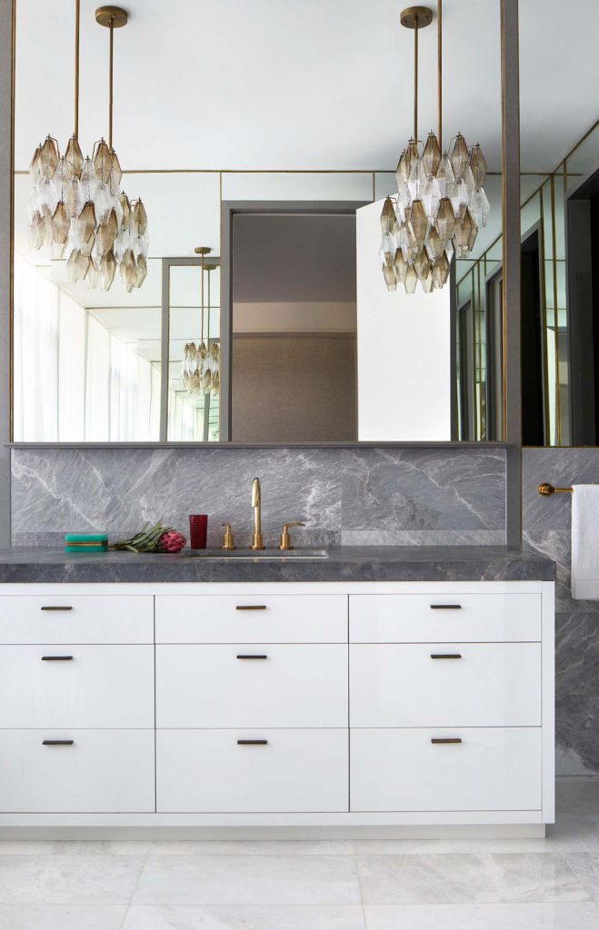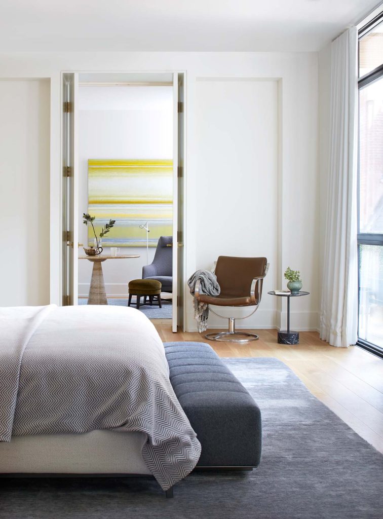 Next, a library/sitting room was positioned directly on axis with the entry foyer, flanked by symmetrical bronze custom French doors, which offer a view through to the garden terrace beyond, and are reminiscent of the stately apartments of Park Avenue or the Fifth Arrondissement. These two rooms elegantly mediate the transition between the public and private zones.