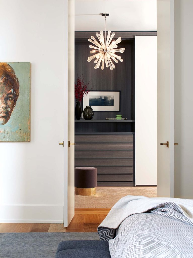 For example, a dramatic two-storey custom bronze screen, inspired by decorative grills from Toronto’s Carlu Auditorium was intended to function, when opened fully, as a divider concealing the kitchen from the dining/living space, but also, when folded into itself, as an architectural pediment framing the deep archway that encloses it.