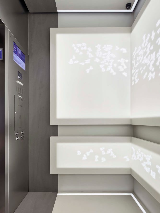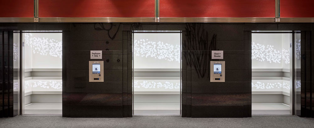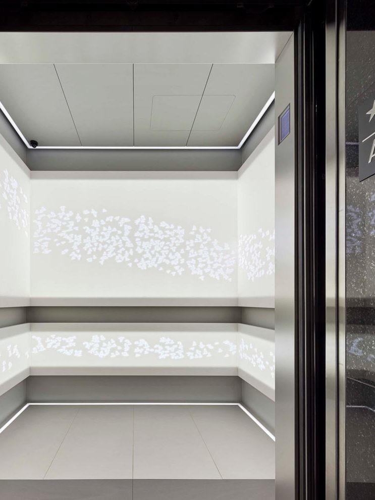 In this vast project with a tiny footprint, everything from technology, lighting, mood, and the rider’s experience needed to be considered. Taking inspiration from two major pieces of art in the ground floor lobby, the design team mounted 869 birds per cab on backlit Corian panels, alluding to the ascent of cab passengers.