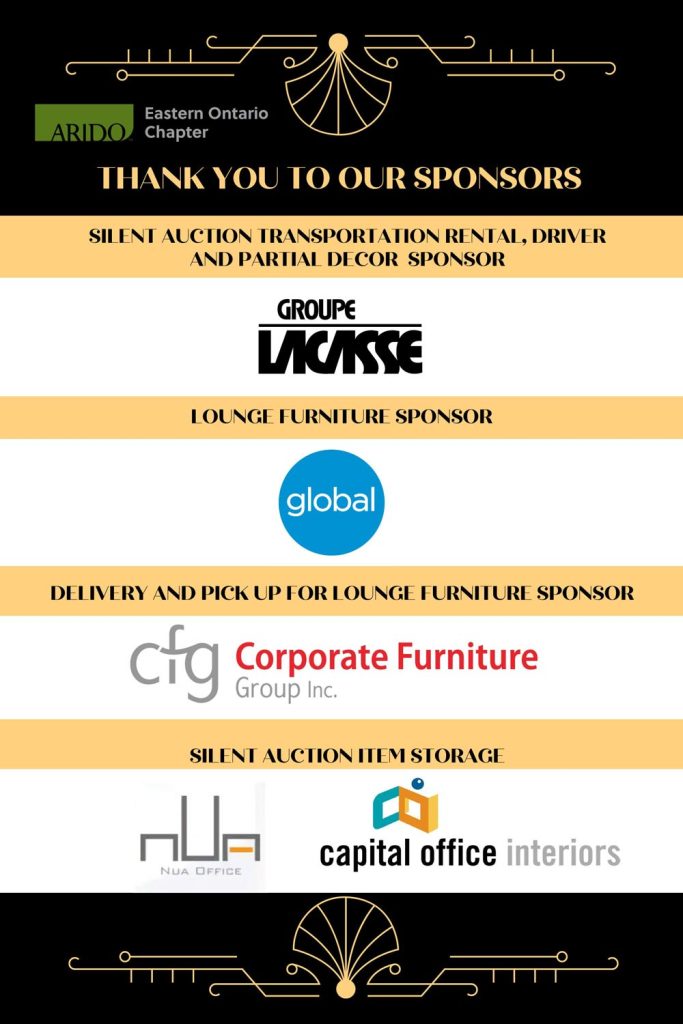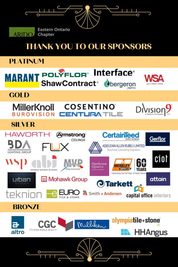 The Association of Registered Interior Designers of Ontario Eastern Ontario Board, along with all of our ARIDO EOC Members, would like to warmly thank our sponsors for our Gatsby Holiday Gala event that occurred this past November 10th and for their ongoing support throughout all of 2023!