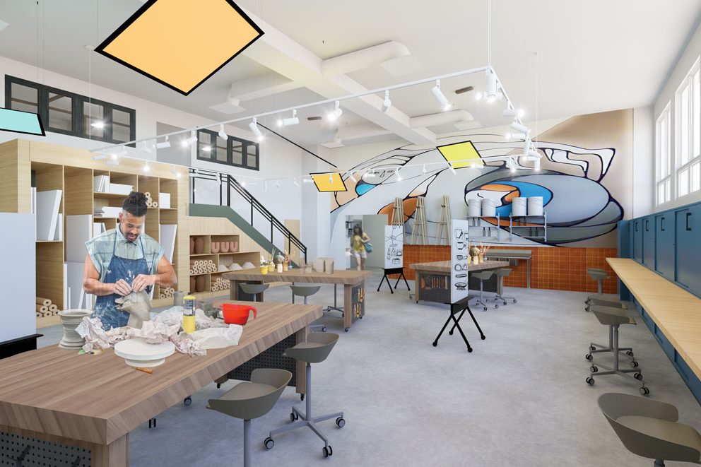 This project considers existing building constraints. The reuse of existing storage cabinets for the art workshop and the decision to keep the ceiling entirely exposed demonstrate a commitment to sustainability and budget-conscious design.