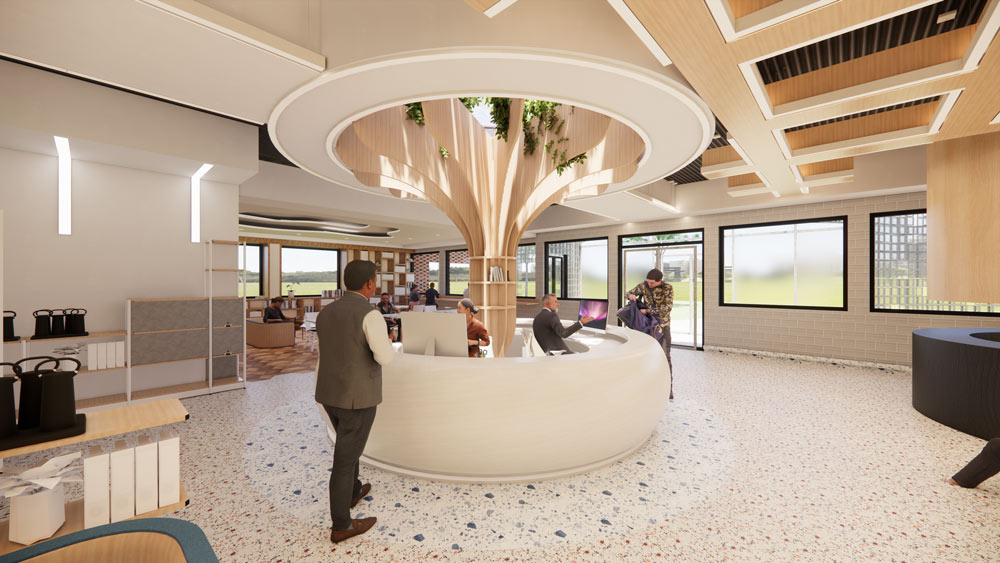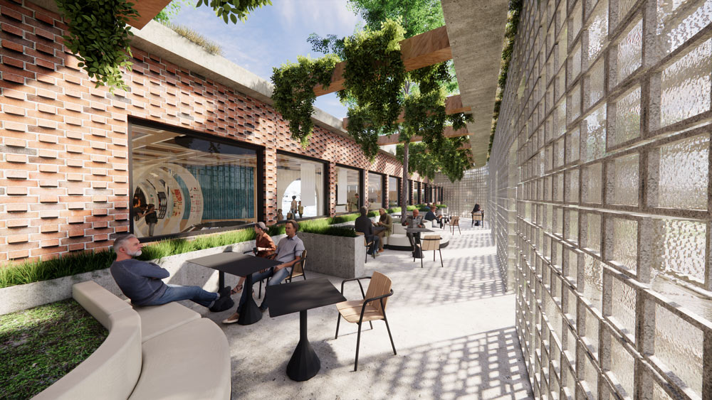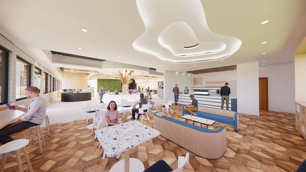 The NEST offers a mix of areas tailored for collaboration and focus work. The space reuses the existing structural framework to define four corners of collaboration: a Maker’s Space, an Innovation Space, a Flex Space, and a Collaboration Space. Additionally, the centre includes a Quiet Zone for those needing a more subdued environment with focus rooms and work rooms branching off. Furthest from the quiet zone is a cafe that fosters casual conversation and comfortable productivity.