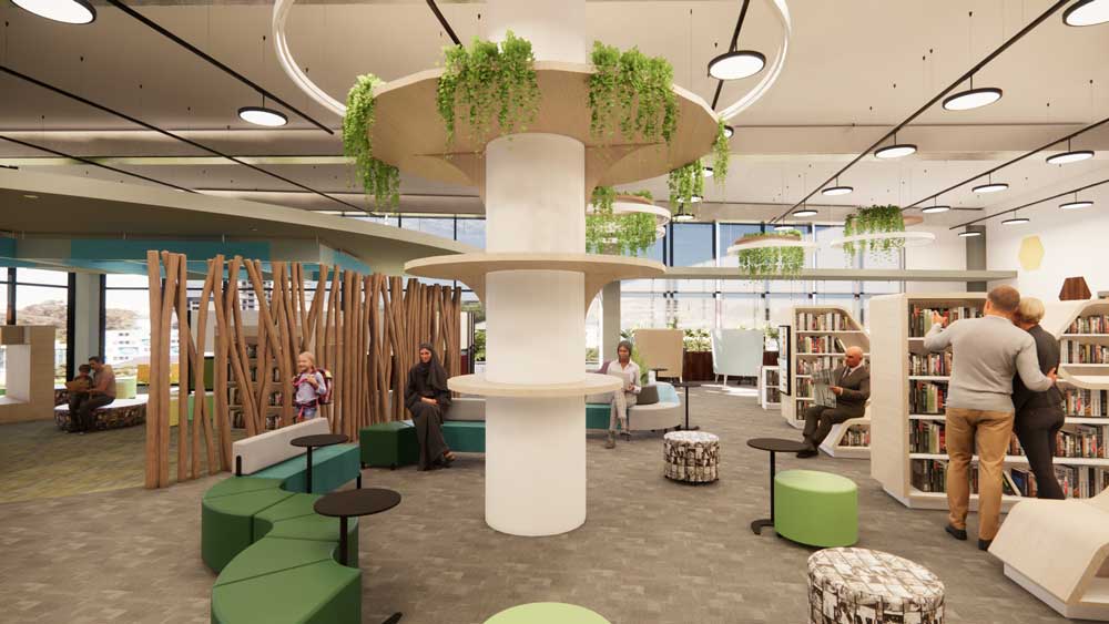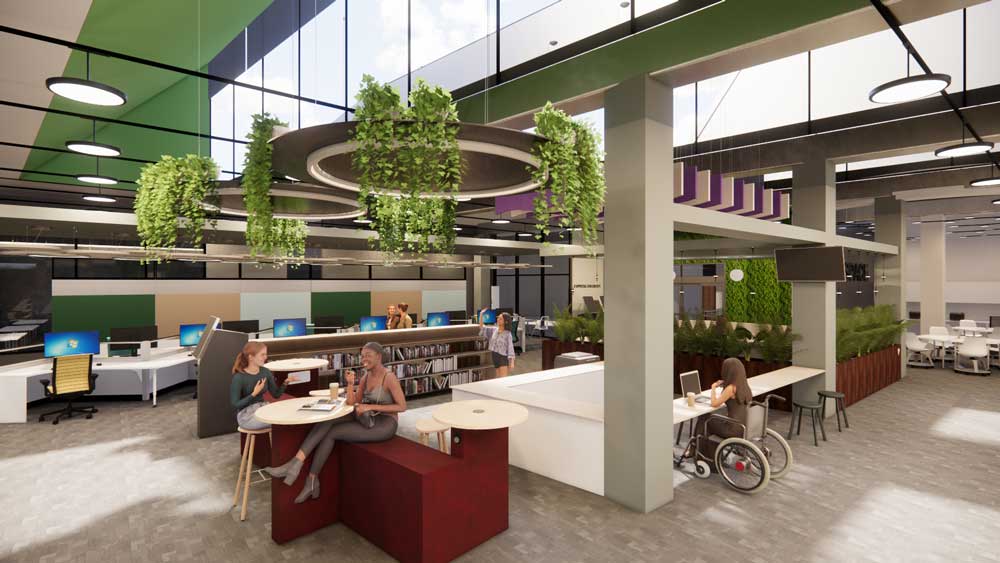 The focus on technology provides opportunities for community members to engage further with artificial intelligence and resources from the Makerspace Labs. To complement the overwhelming amount of technology, biophilic elements, such as organic shapes, real and artificial plants, and an earthy colour palette, are used to create a calming environment for all users. The design is modular and flexible to accommodate demographic shifts, societal norms, and technological advancements.