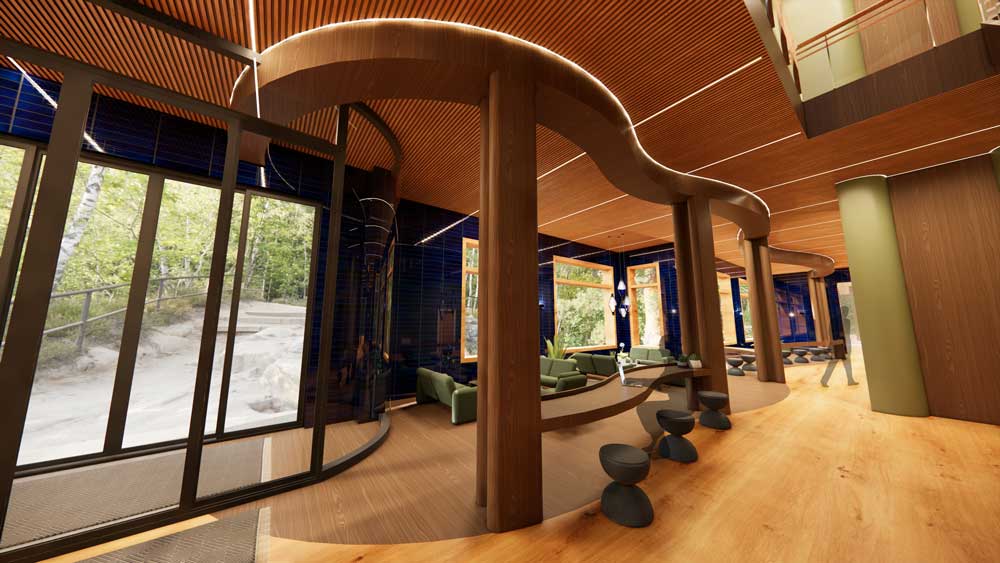 The hotel will provide flexible indoor spaces to be used for indoor activities, workshops, conferences, and other learning experiences. The design of the hotel will be a place that sustains the natural environment, rather than detracting from it. Materials and furniture selected will be durable and manufactured locally within Ontario to reduce transportation emissions and increase life cycle. Hawk River Inn will contribute