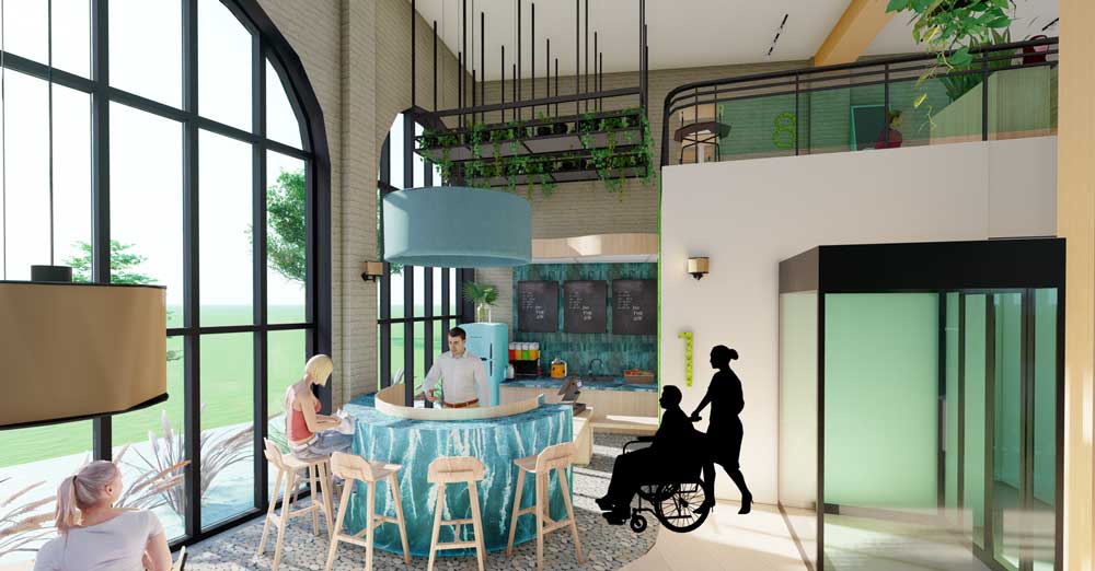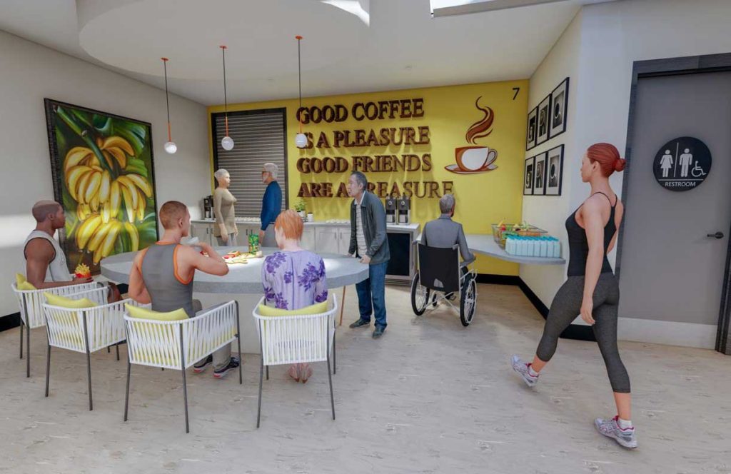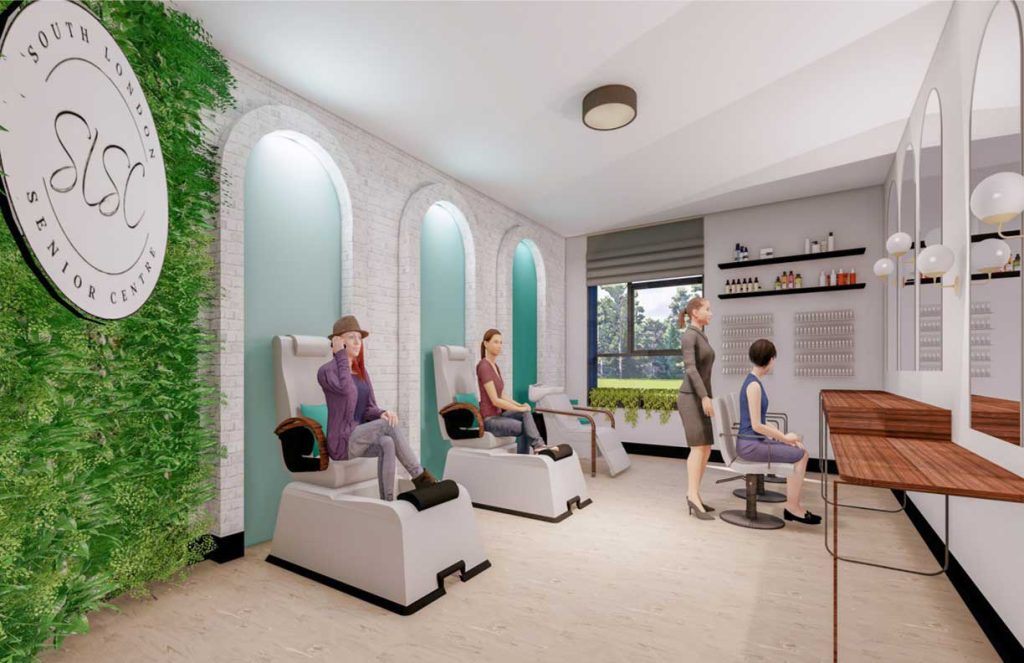 Flexibility in sustainable, durable, cleanable materials, and function will provide an inclusive environment for all staff and seniors aged 50+, and the space will be easily comprehensive through recognizable wayfinding techniques. Public and private areas emphasize community connections and contribute to meaningful experiences that promote belonging, choice and independence to improve the quality of life for all members and staff.
