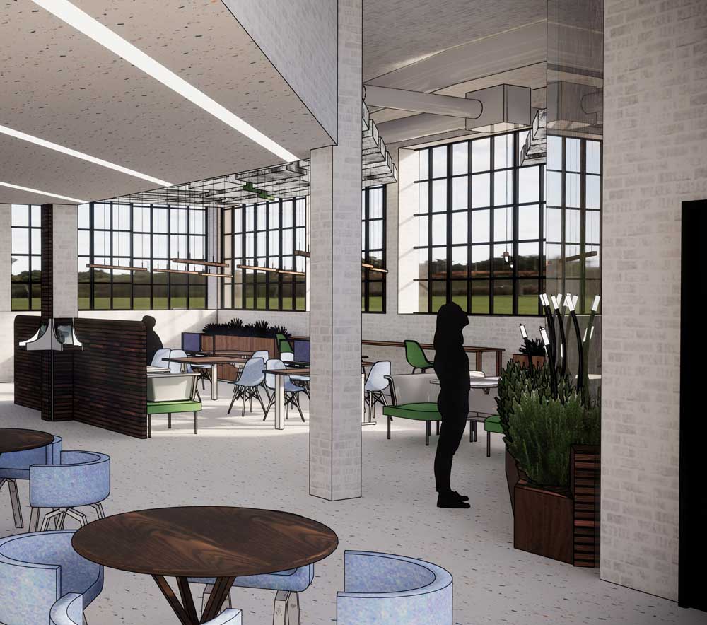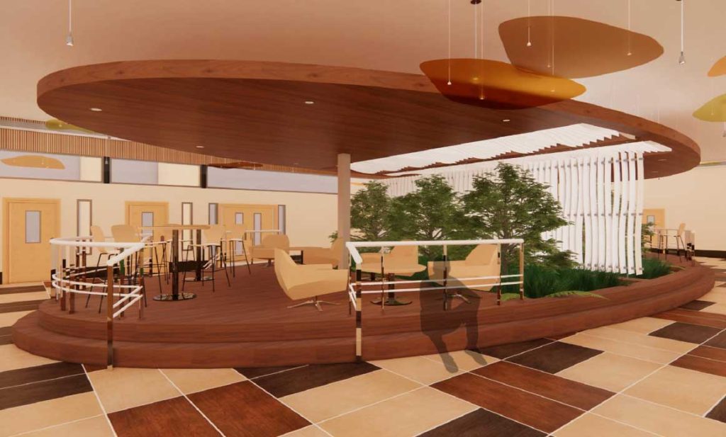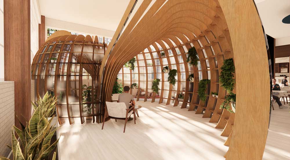 The presented renderings depict the indoor garden, kitchen, dining room, and quiet nooks. These spaces