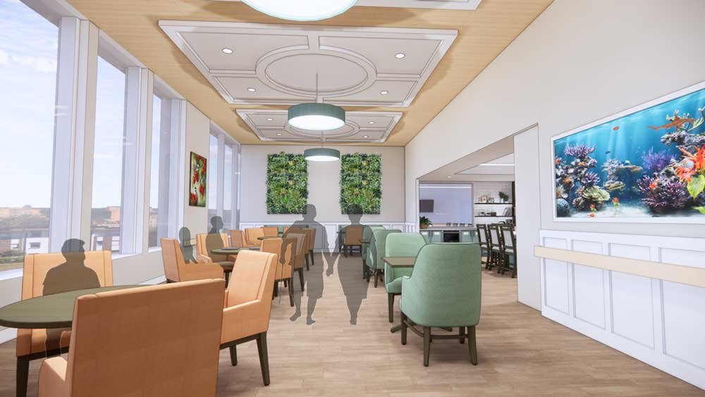 Through a home like atmosphere with versatile spaces and an indoor garden, the facility aims to reduce the stigma around the medical condition by creating an inclusive community that supports one’s social, cognitive, and physical health and well being. A combination of group and quiet settings, natural lighting, contrasting colours, sound absorbing materials, and open sightlines help minimize dementia symptoms to promote occupant independence and fulfillment.