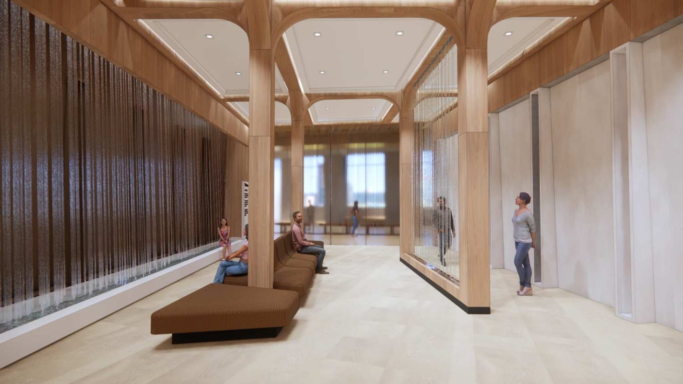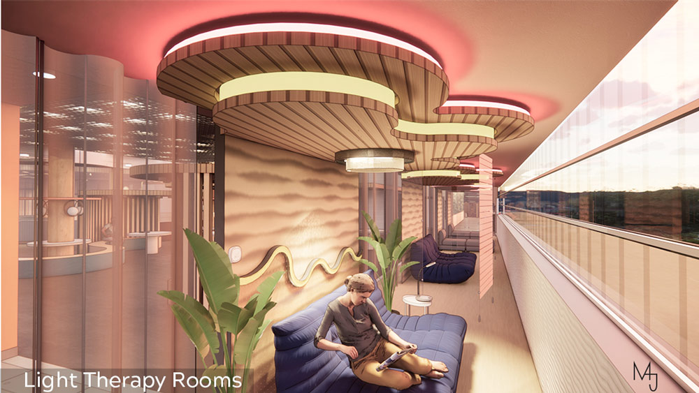 Three soundscape rooms were designed to incorporate well-researched calming environments. The first room is an instrumental soundscape inspired by music halls, featuring classical music. The second room simulates a waterfall soundscape, with the soothing sounds of falling water. The third room offers a multisensory experience, including the sense of touch through vibrations. This room allows occupants to immerse themselves in the physical dimension of sound, making it accessible for individuals with hearing impairments and featuring music composed by hearing-impaired artists.