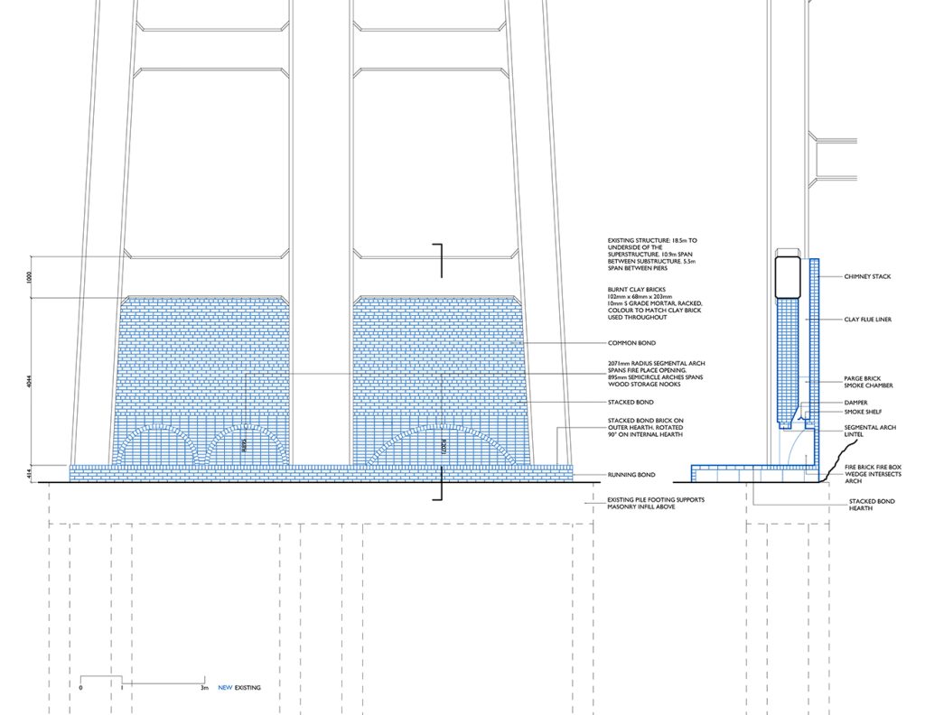 Brick pays homage to the history of the site, Don River Valley. By utilizing the foundation and pile caps of the substructure and arches, I can support heavy loads of brick which is essential to achieve the large scale of my infills. I hope to create an “urban room” that lasts 100 years and ages through time.
