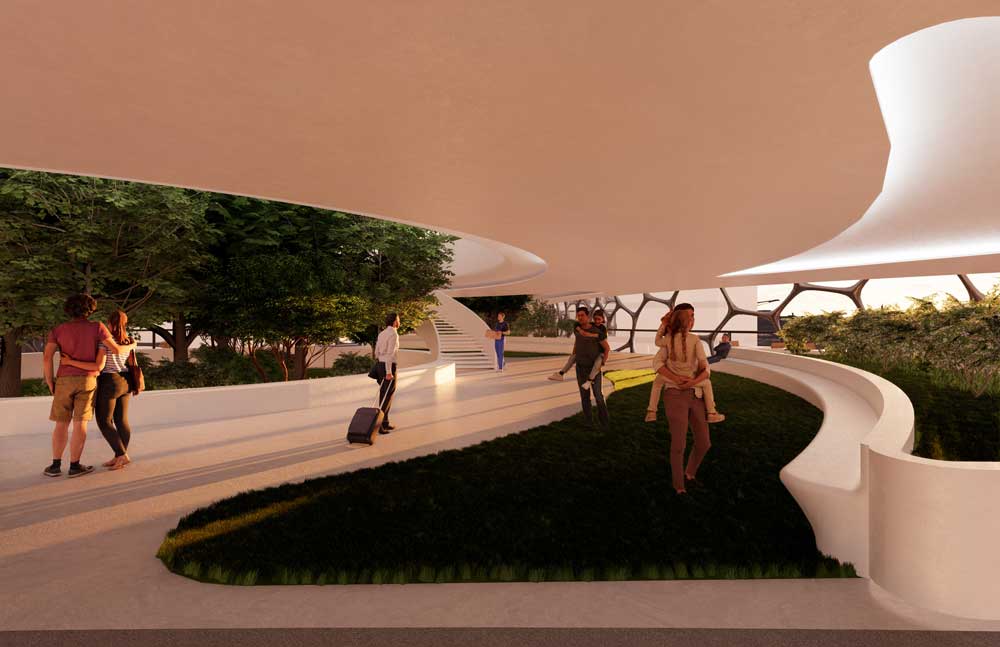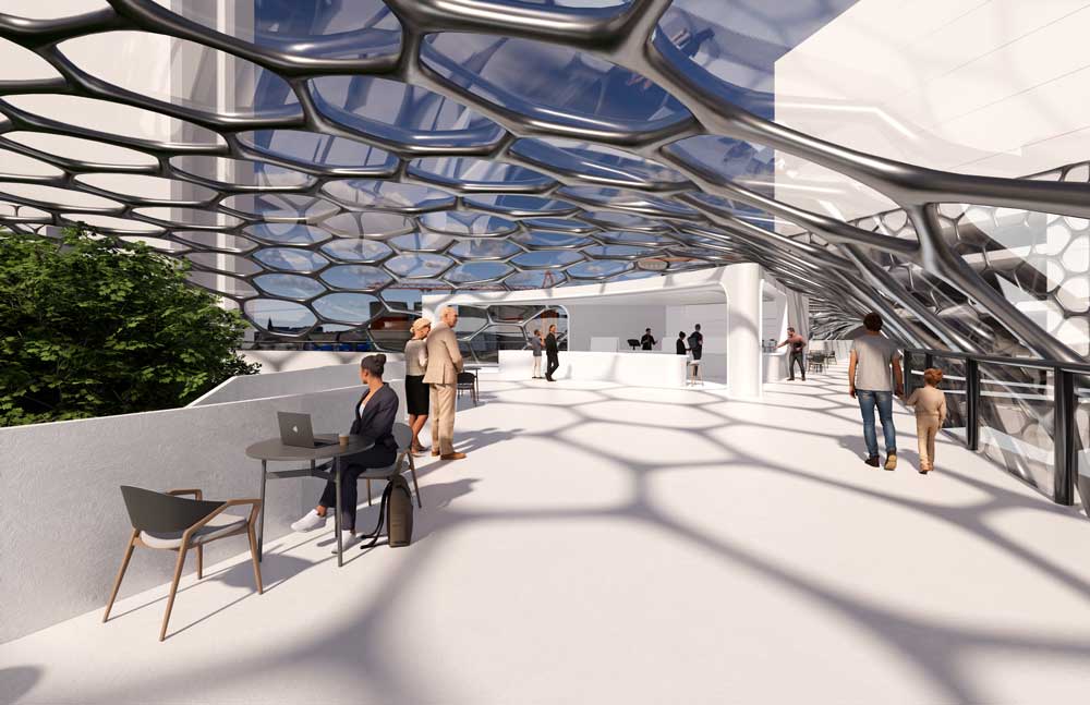 There is a dearth of nearby green space in large urban cities like downtown Toronto. What if we created an intervention placed between 2 or more structures that become an elevated horizontal green space? The intervention for this site uses 2 web-like forms that span across skyscrapers within the vicinity, repurposing this empty vertical space between the buildings into a new horizontal space. The 2 storey green space will include a walking/running track, a cafe, and other amenities, allowing the public to relax and get a breath of fresh air in the city.