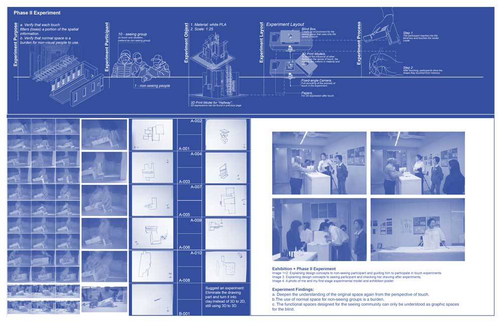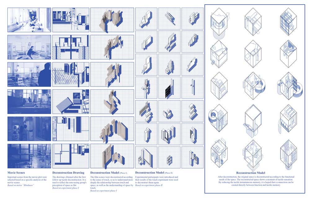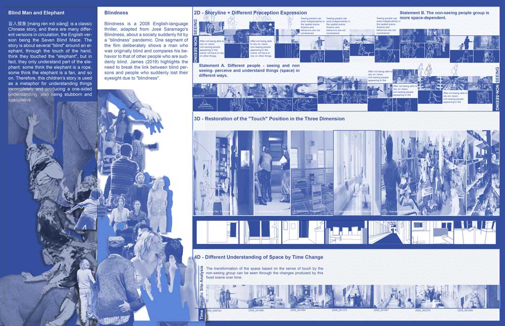 Therefore, I used this idea as an entry point for research and creative practice in this study. Using the institutional interior (from the movie) as an entry point, inspired by the Chinese children’s book Seven Blind Mice, the interior is deconstructed through the sense of touch, the way non-seeing people perceive the world, to create a liminal space.