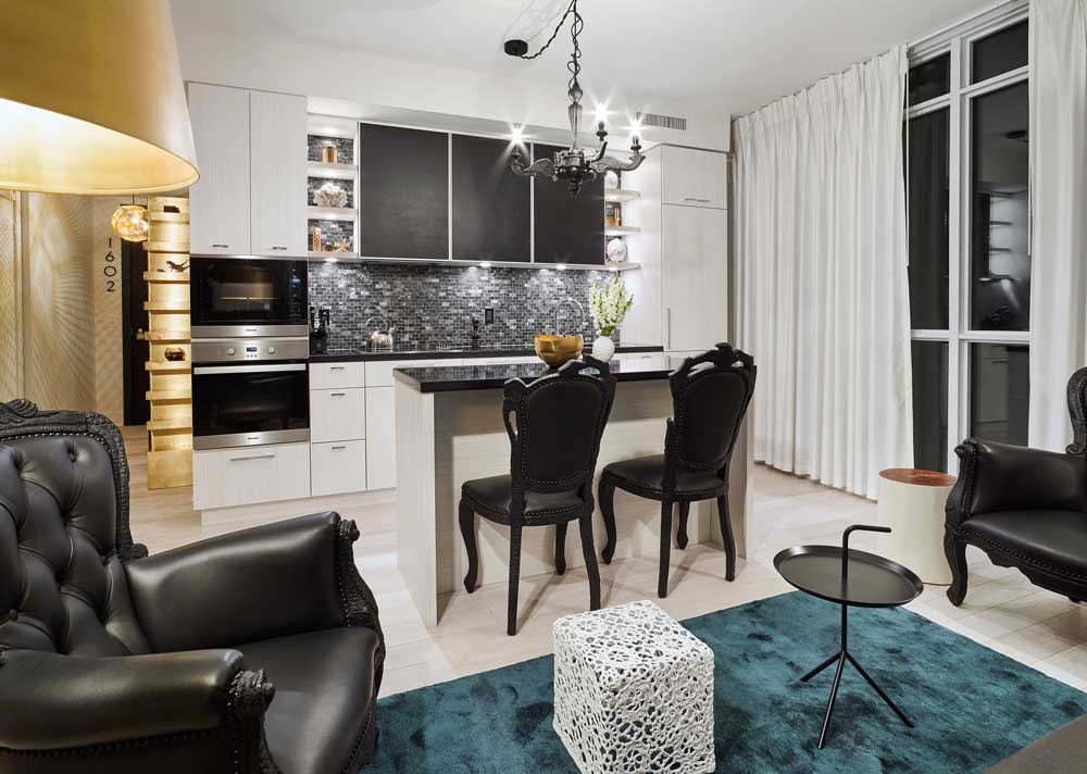 Black natural stone tiles in the bathroom surfaces as well as black kitchen countertop and backsplash perfectly complement the brass elements throughout the space. To add softness to the overall design and keep a unified aesthetic throughout, the upper kitchen cabinets were clad with faux-leather panels to match the leather furniture in the living area.