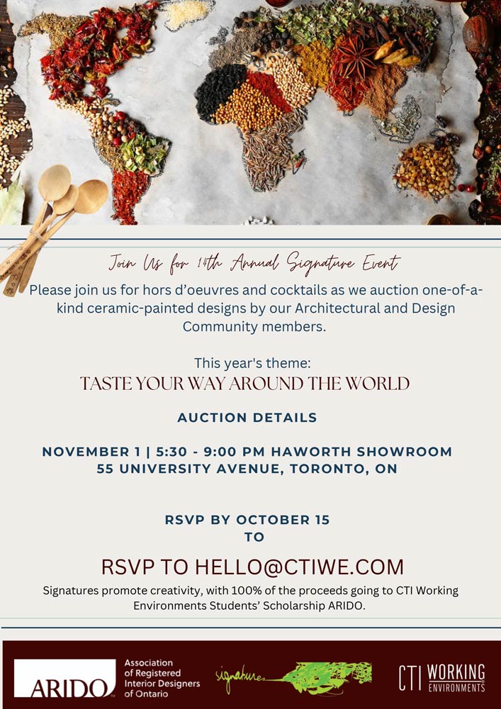 Please join CTI Working Environments for hors d’oeuvres and cocktails as they auction one-of-a-kind ceramic-painted designs by their Architectural and Design Community members.