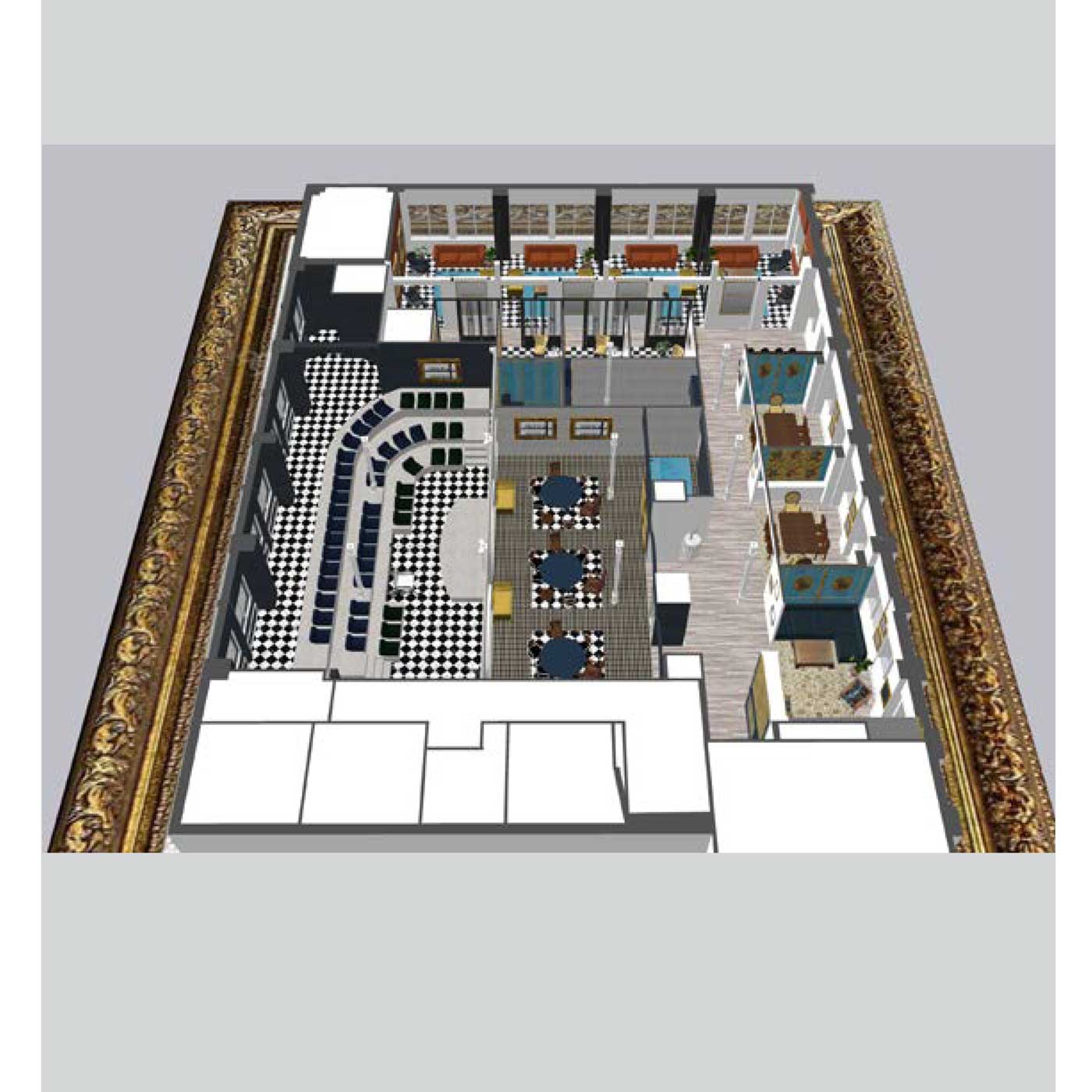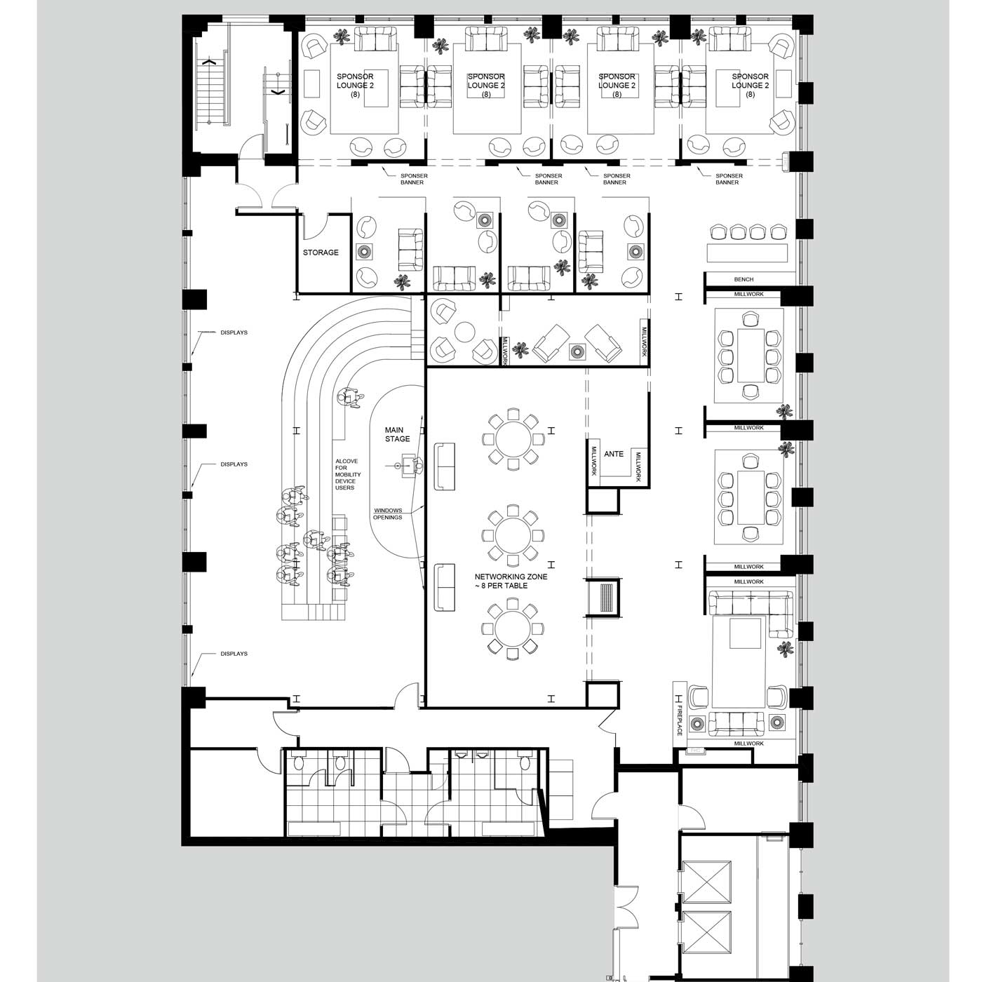 The sponsor lounge area provide comfort and open spacing to all for easy follow of members through the space. Lastly, we included a long bar area at the entrance to invite guests into the space and create a fun and social atmosphere.