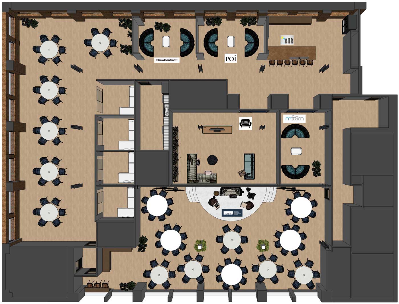 Greenery, natural materials and furniture layouts that encourage gathering mirror the concept of the community garden. While hues of primary blue, blue grey, light blue, white and black act as accent colours as well as aid in the incorporation of ARIDO branding.