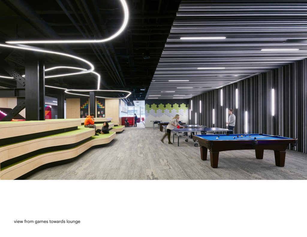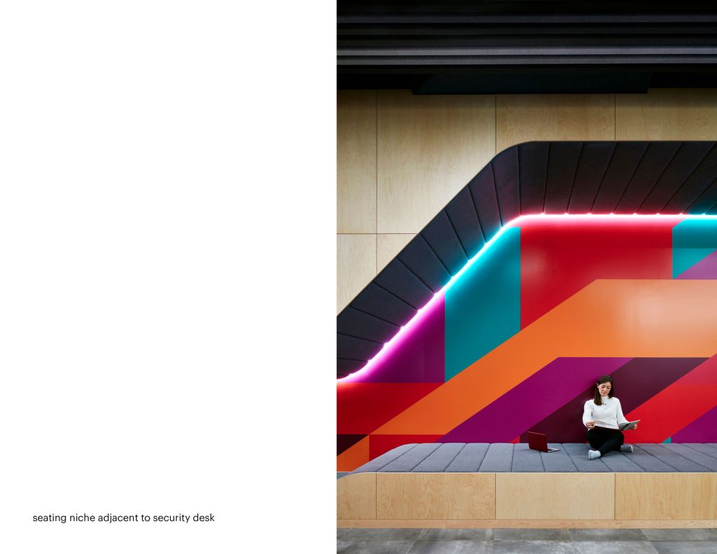 Finally, the main security desk is integrated into a wall with a seating niche opposite to balance the function of this space. Casual “touch down” areas were implemented to reinforce serendipitous exchange. Just beyond the main desk is an open, unexpected feature to support collegiality: a multi-tiered “mountain” that acts as a place to casually hang out. The inspiration is Mount Royal, which rises above the downtown campus.