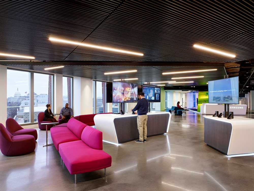 Challenged with creating a future forward technology experience center focused on expanding Samsung’s Federal Government relationship, the vision for this office space in Washington DC resulted in an “Infinitely Immersive” flexible showcase environment driven by seamlessly embedded interactive technology.
